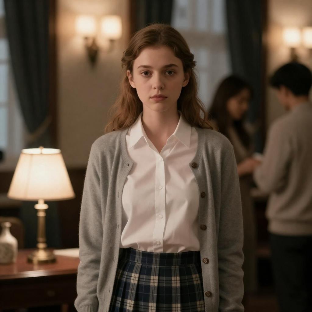 Photograph of a movie theater. A young woman with light brown hair in a pink tank top and blue suspenders sits in front, looking upward. Behind her, a woman with blonde hair in a white jacket looks ahead. To the right, a man in a Santa costume with white beard and glasses reads a program. They are seated in front of movie theater seats. The man's right hand holds a blue object. The background is dimly lit.