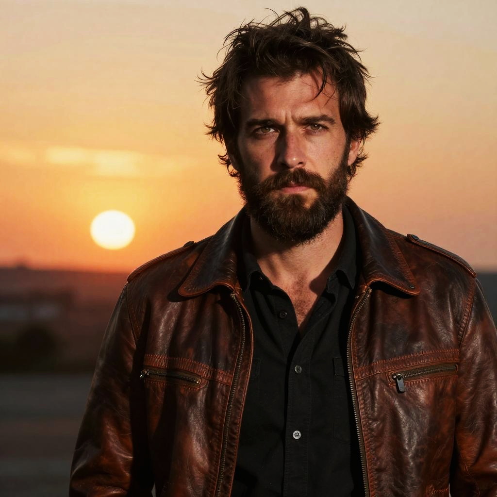 Photograph of a rugged, bearded man standing confidently in a golden wheat field under a clear blue sky. He's wearing a bright yellow short-sleeve button-up shirt, blue jeans, and a brown belt. His hands are on his hips, and he's looking directly at the camera with a serious expression. He has short, dark brown hair and a watch on his left wrist. The wheat stalks are tall and swaying gently.