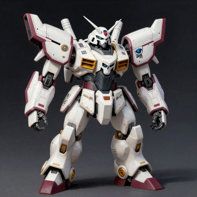 Photograph of a white and red robotic mecha with orange accents, standing in a dark gradient background, featuring intricate mechanical details and a menacing stance.