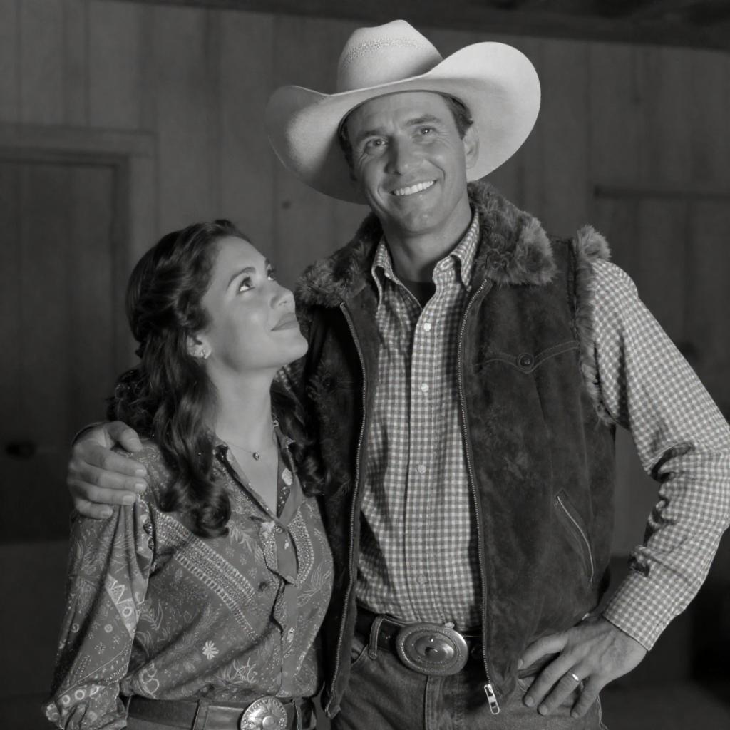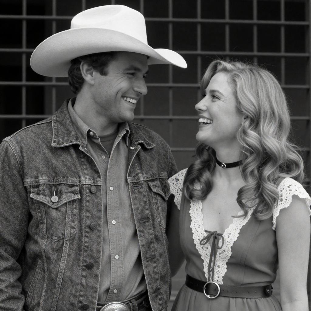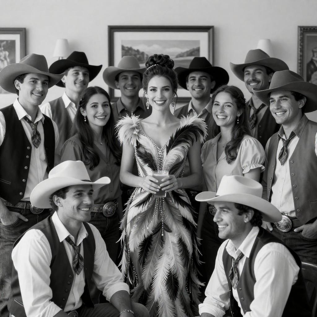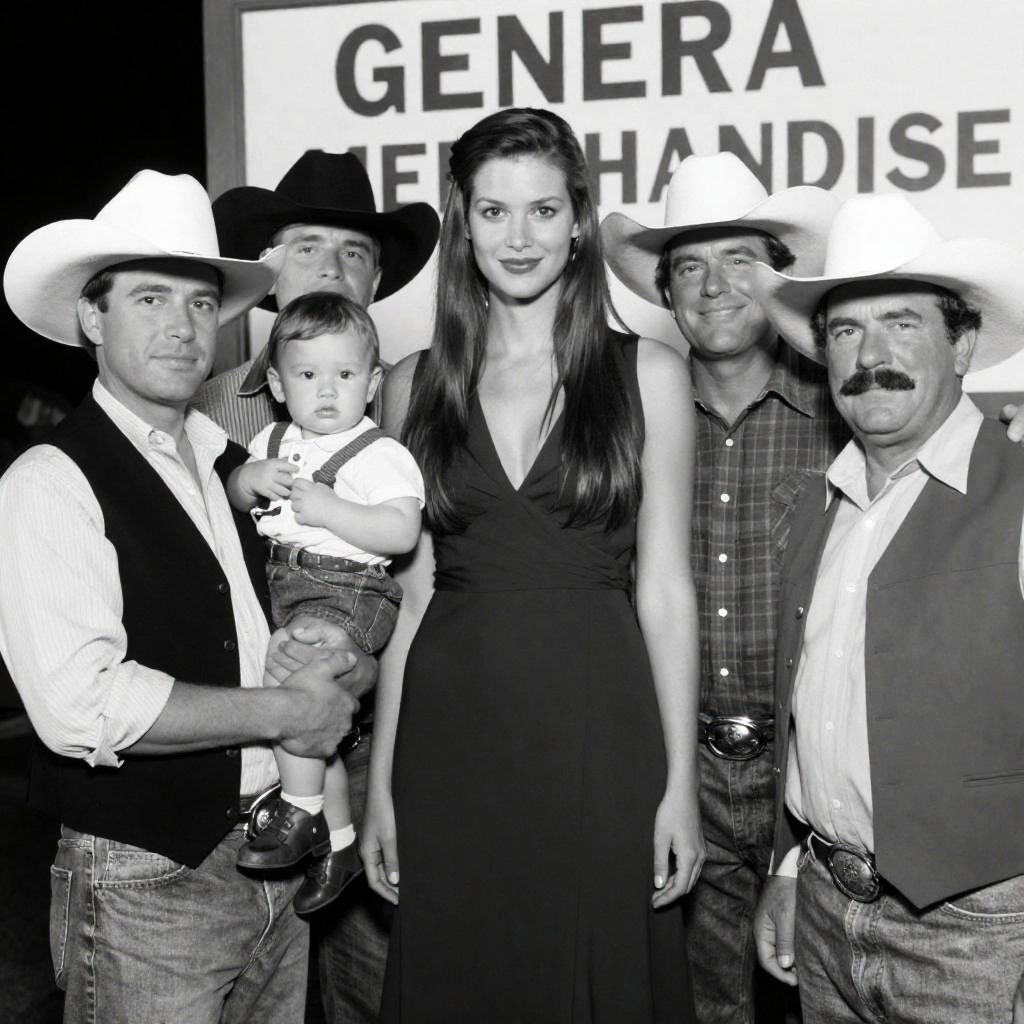 Black and white photograph of a film premiere. Tall woman in dark dress stands center, smiling. Four men in cowboy hats and vests surround her. Man on left holds baby. Sign behind reads "GENERA MERCHANDISE." Man on right has mustache. Casual, festive atmosphere.
