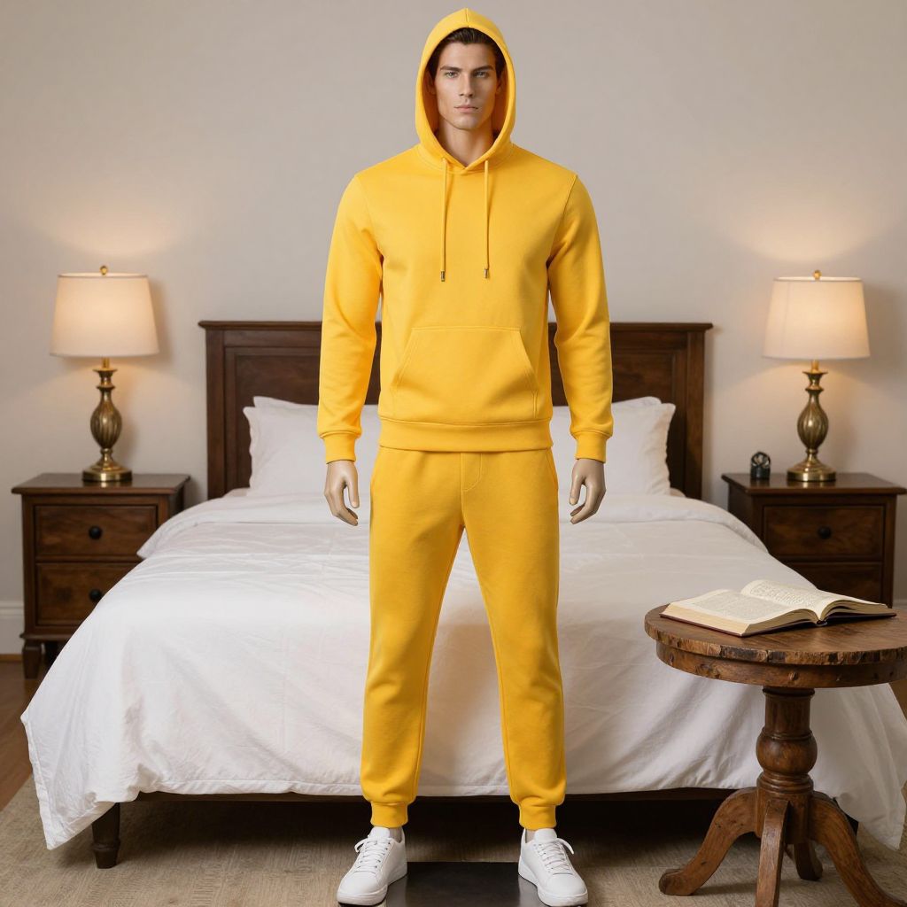 A handsome, athletic male mannequin with sharp features, wearing a bright yellow sweat suit complete with a hood and matching sweat pants. The mannequin is posed standing in front of a neatly made bed with a crisp white bedspread. Flanking the bed are two elegant lamps, and to one side sits a rustic wooden table displaying an open book.