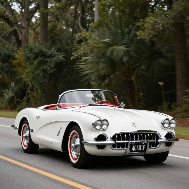 Classic 1962 Chevrolet Corvette convertible cruising down a serene tree-lined road in Summerville, Georgia, showcasing its pristine white exterior, vibrant red interior, and iconic license plate reading \"40601F.\