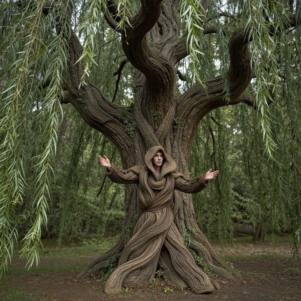 Whomping willow costume, a detailed cosplay of a giant animated tree with twisting branches and leaves, wearing it in a lush forest setting, rich textures, intricate bark patterns, dynamic pose, fantasy theme, cinematic lighting