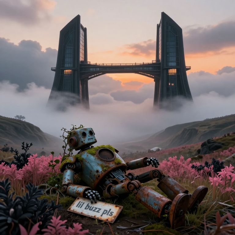 In the foreground lays the whimsical, decaying, moss-covered, and weathered metal body of a long-defunct robot, its rusted frame blending completely into the natural environment, Beside it, an old, half-rotted sign lies on the ground, bearing the faded text \"some buzz pls, \" hinting at its past use as a begging shield, The robot’s head, overgrown with vines, gives an eerie sense of abandonment and forgotten technology, Behind this rusted relic, a massive abyss hovers in the vastness of outer space, its colossal form seemingly bowing down to the viewer, Two towering structures, forged from black metal, rise ominously into the high clouds, Their sleek, modern-medieval design incorporates both sharp geometric angles and massive windows that reflect the fading light, A bridge of cold, gleaming metal connects the two towers, reinforcing their imposing presence in the sky, The hyper-realistic scene captures a tranquil, mist-shrouded landscape at twilight, with rolling hills and deep valleys bathed in soft orange light, The terrain is covered with delicate shrubs and grasses, their leaves tinged in deep black-pink hues, creating a striking contrast against the cool, misty atmosphere, The decaying robot’s weathered form, set against the towering black metal structures, evokes a haunting sense of the passage of time, where nature slowly reclaims the remnants of a long-lost civilization