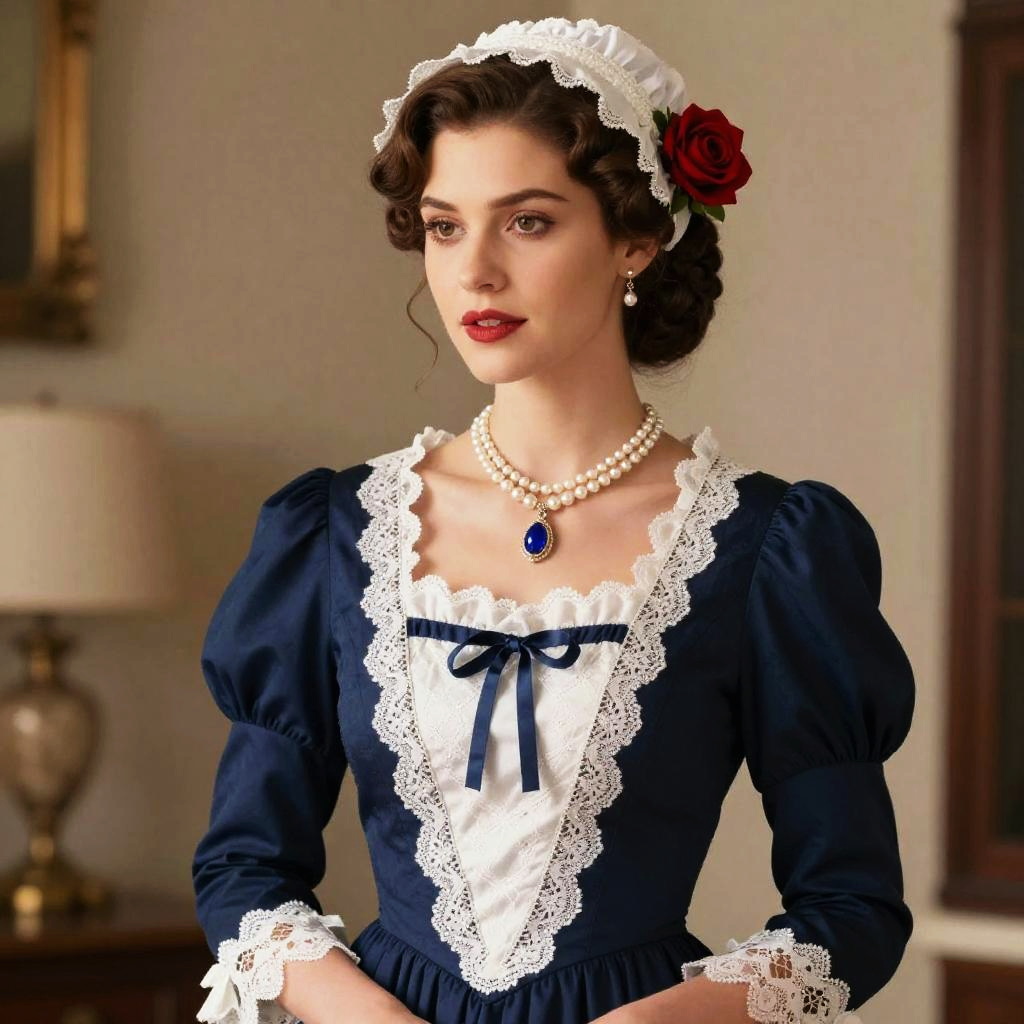 A woman dressed in a detailed Miss Elizabeth costume stands poised, featuring a navy blue dress with white lace accents and puffed sleeves, complemented by a white bonnet adorned with a red rose. The soft, cinematic lighting highlights her vintage-inspired hairstyle and elegant pearl necklace with a blue pendant, capturing the classic cosplay style with a refined editorial touch.