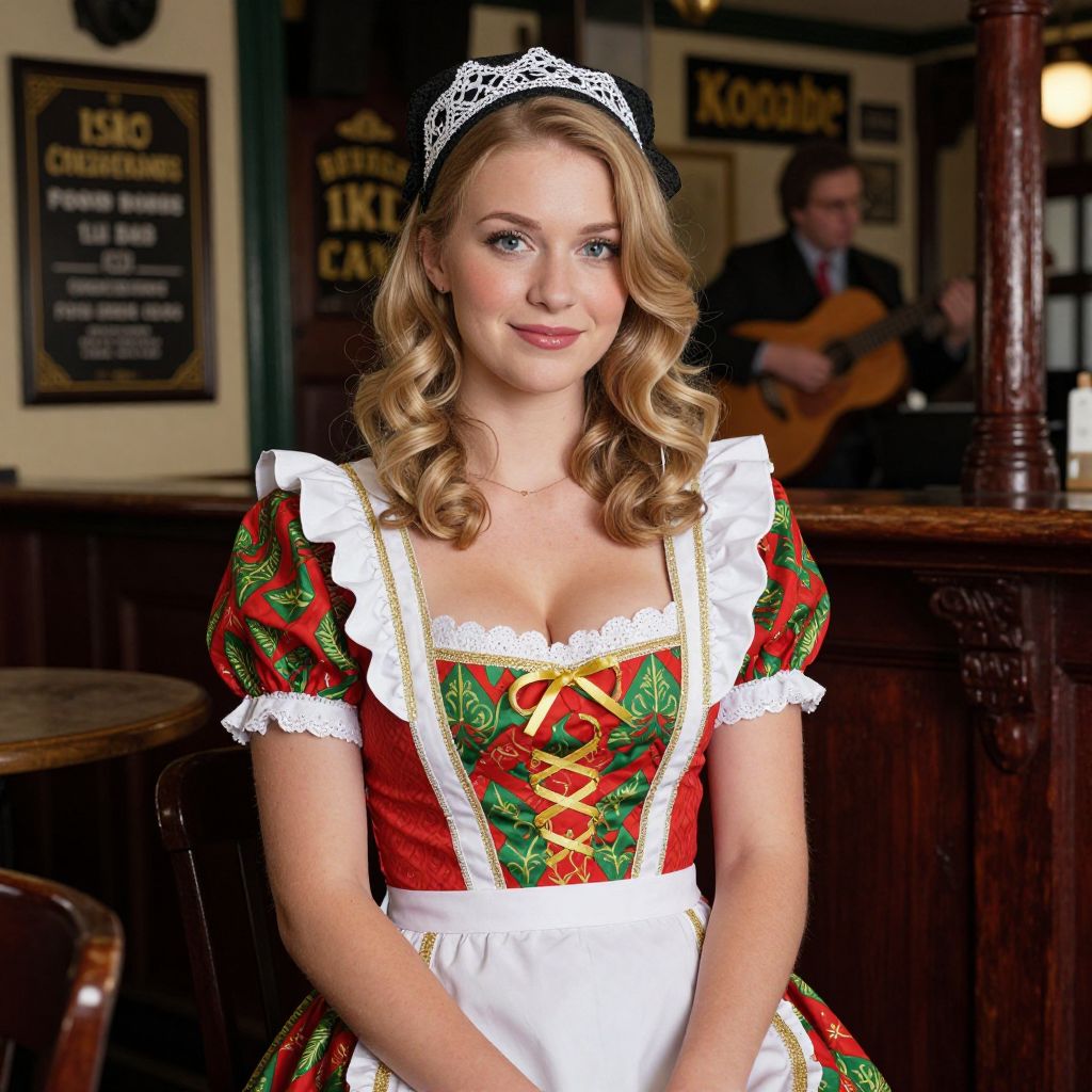 Photograph of a fair-skinned, blonde woman with curled hair, wearing a red and green floral-patterned, puffed-sleeve, lace-trimmed maid dress with a white apron. She has blue eyes, pink lipstick, and a small, white lace headband. She is seated in a dimly lit, wooden-paneled bar with a man playing a guitar in the background. The bar signs read "Irish Championships" and "Kodiak." The lighting highlights her soft, smiling expression, while the background is slightly blurred, focusing attention on her. The overall style is reminiscent of a vintage, Irish pub setting.