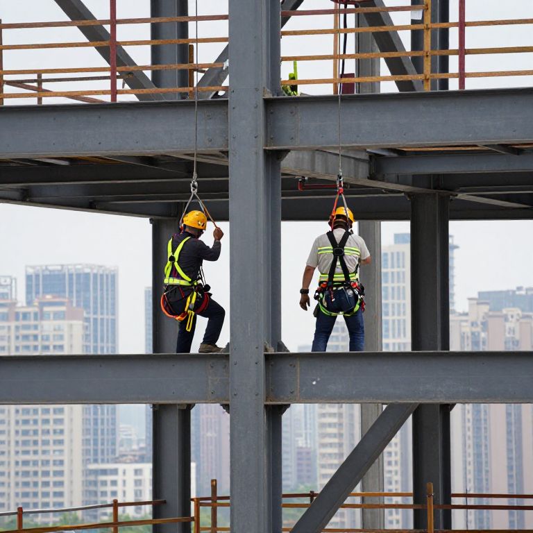 A detailed shot of construction workers on a high-rise building site, with steel beams, safety harnesses, and a city skyline in the background.