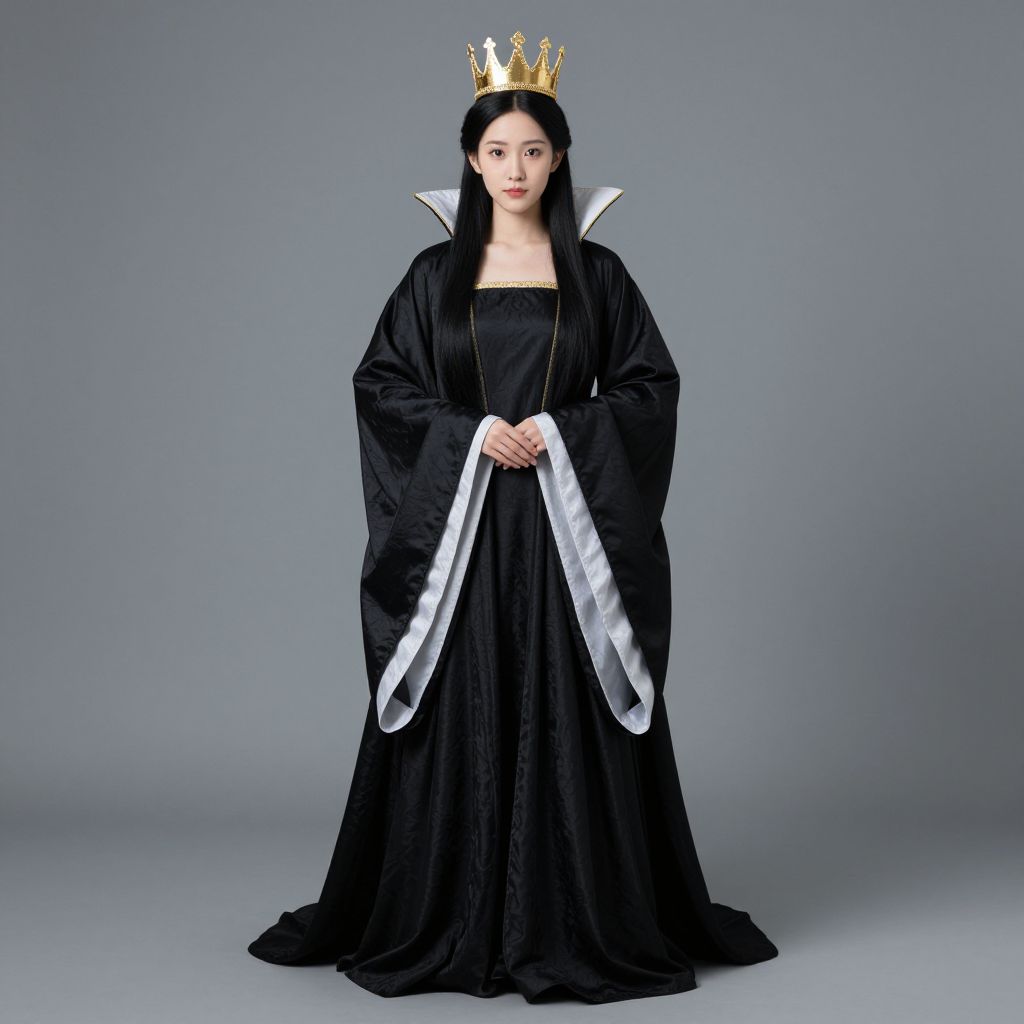 Adult queen costume, 1girl, solo, crown, black hair, standing, full body, long hair, looking at viewer, long sleeves, robe, closed mouth, dress