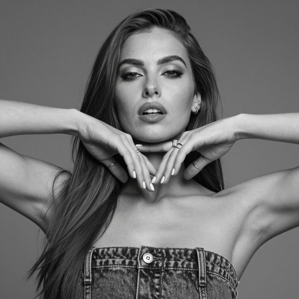 Monochrome photograph of a woman with light skin and dark hair, wearing white gloves, with her hands on her head, looking upward. Her expression is neutral. The background is dark and out of focus. Her shoulders are bare. The image has a grainy ure.