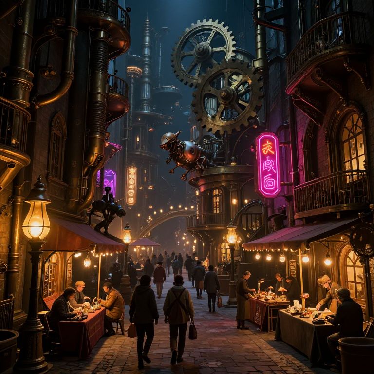 Steampunk-style nighttime alleyway with glowing neon signs, gear mechanisms, and warmly lit outdoor cafes, bustling with patrons and steam-powered architecture.