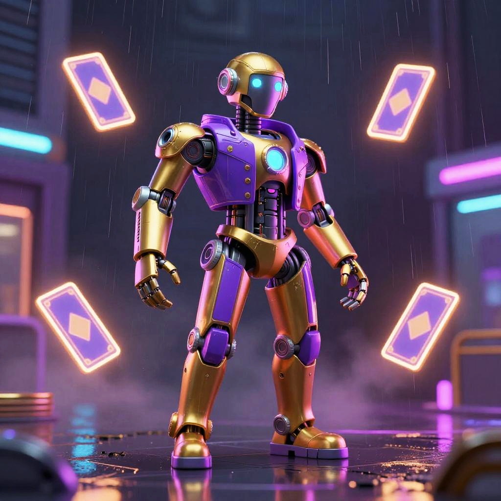 Glowing, golden robot with top hat, blue eyes, and neon accents stands in rainy cityscape, surrounded by floating neon cards. Digital artwork