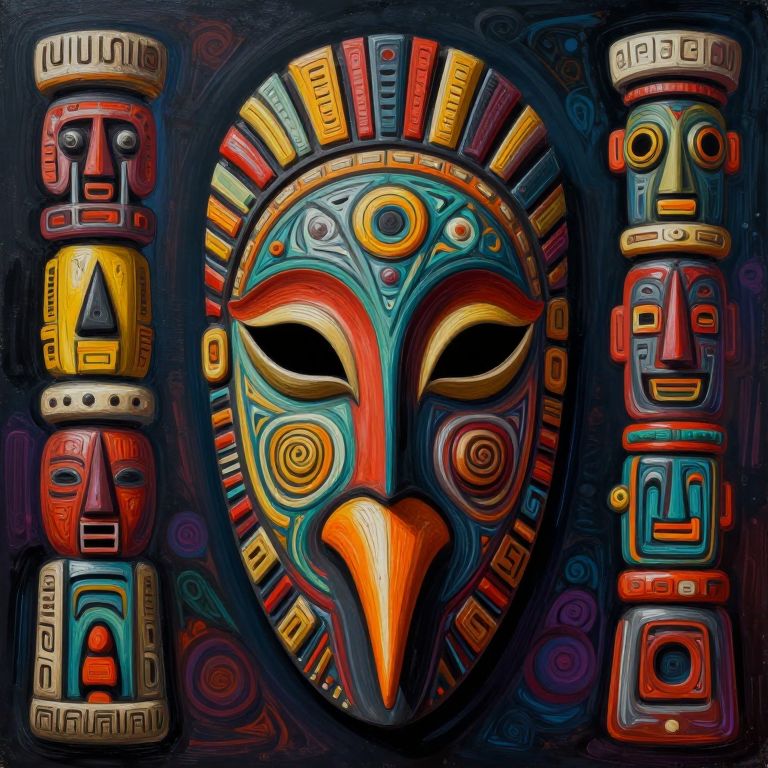 Jacquard a colorful painting of a hand carved bird mask, in the style of columns and totems, digital expressionism, mbole art, kushan empire, mr. doodle, dark symbolism, igbo (ibo) art,