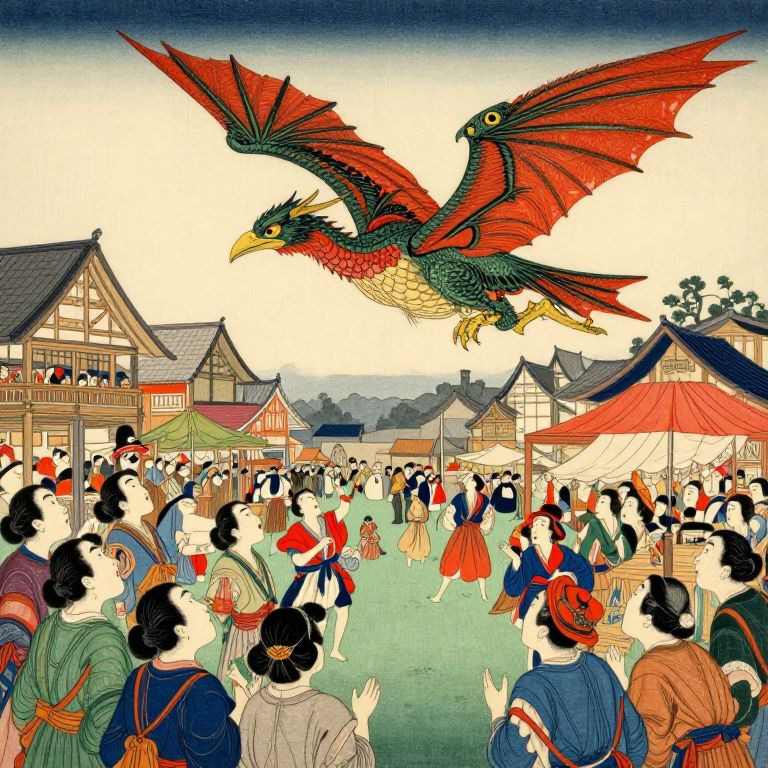 Traditional Japanese woodblock print: A red and green phoenix soars over a bustling village festival with crowd, colorful kimonos, and traditional buildings.