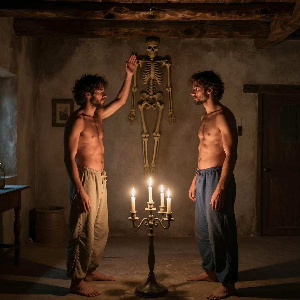 Two people stand in a dimly lit room with numerous candles on the floor. A man with long dark hair, beard, and sleeveless vest faces a woman in a long black dress. They are close, looking at each other. Background includes bookshelves, a window with green bars, and an armchair. Candles cast warm light.