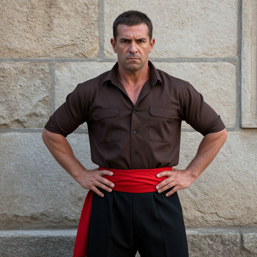 A man wearing a brown shirt and black pants with a red sash tied around his waist, standing in front of a stone wall with his hands on his hips. The man has a strong, muscular build, with a confident and assertive demeanor. His facial expression is serious and determined, reflecting the gravity of the moment. The lighting is natural, with soft shadows that accentuate his features and the texture of the stone wall in the background. The overall atmosphere is rugged and stoic, emphasizing the man's strength and presence.