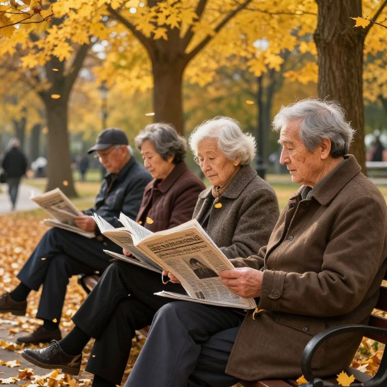Giornali in the hands of elderly people sitting on a park bench under autumn trees, golden leaves falling, warm and peaceful setting, detailed expressions, soft background blur, painterly style with vibrant autumn colors