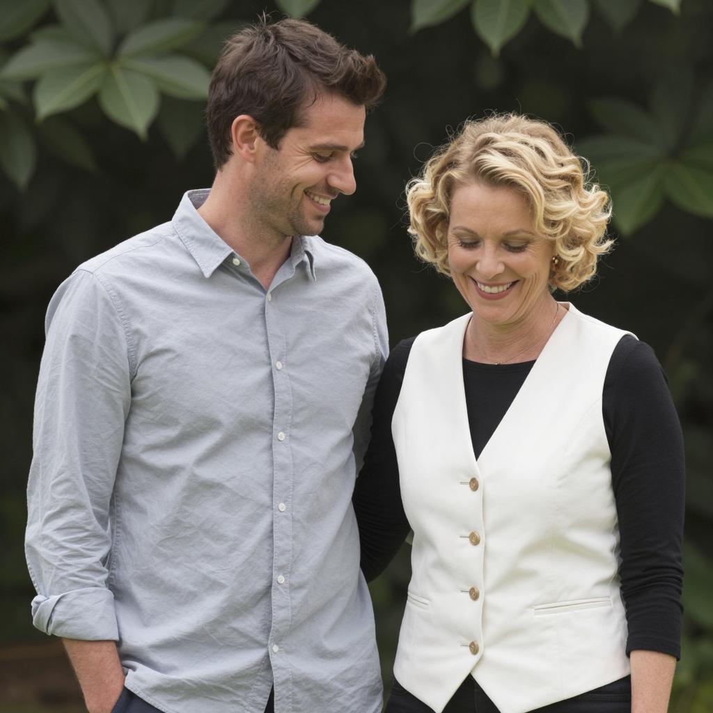 Blonde woman with shoulder-length hair, smiling, pours champagne from a green bottle into a glass held by a middle-aged man with gray hair, wearing a white shirt and black polka-dot tie. Both seated at a wooden table, background has dark horizontal blinds.