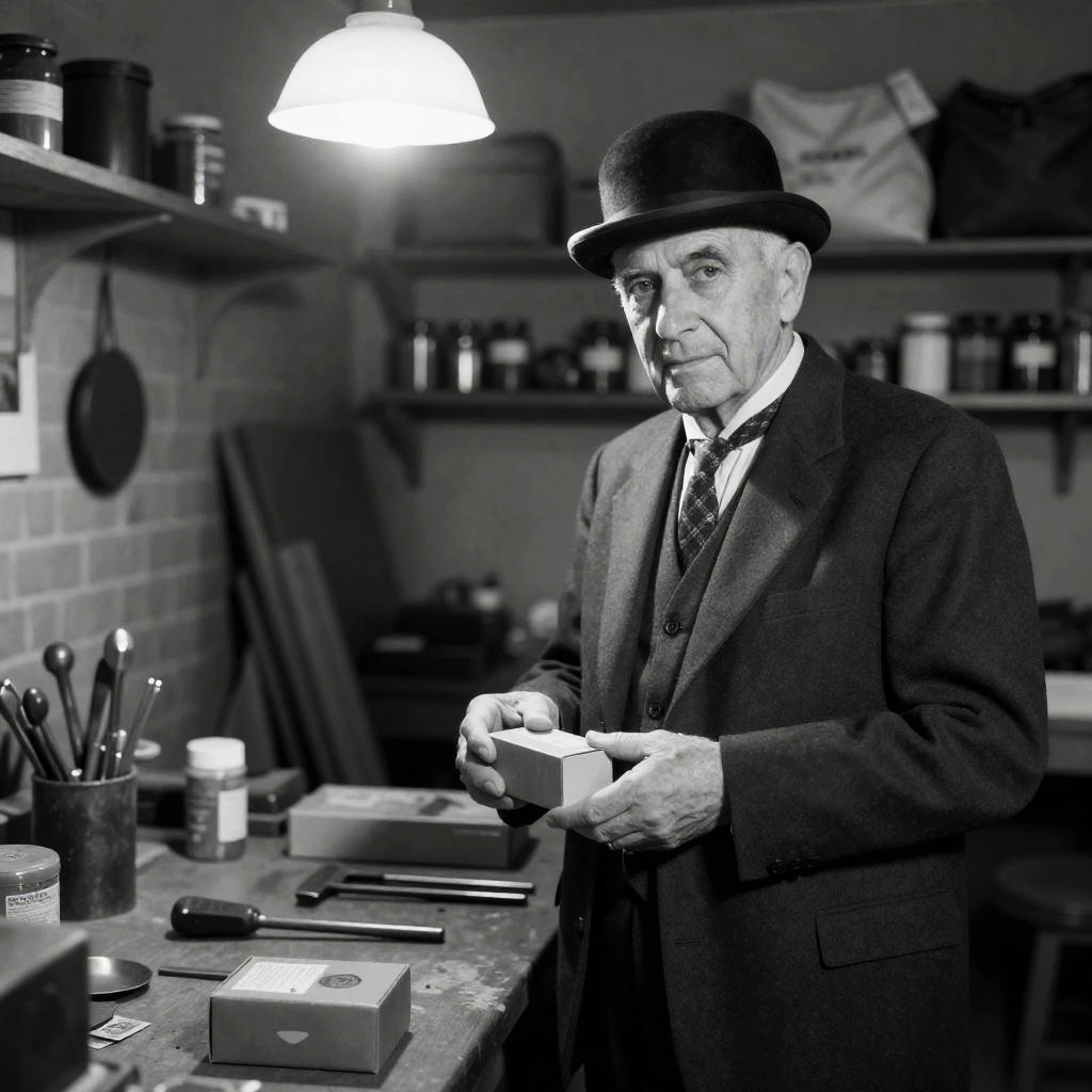 Black-and-white photograph of an elderly man in a bowler hat, dark suit, and tie, holding a small box. He stands in a cluttered workshop with brick walls, various tools, and boxes on tables. Overhead light shines down. Background includes shelves with jars and bags. Man's expression is neutral.