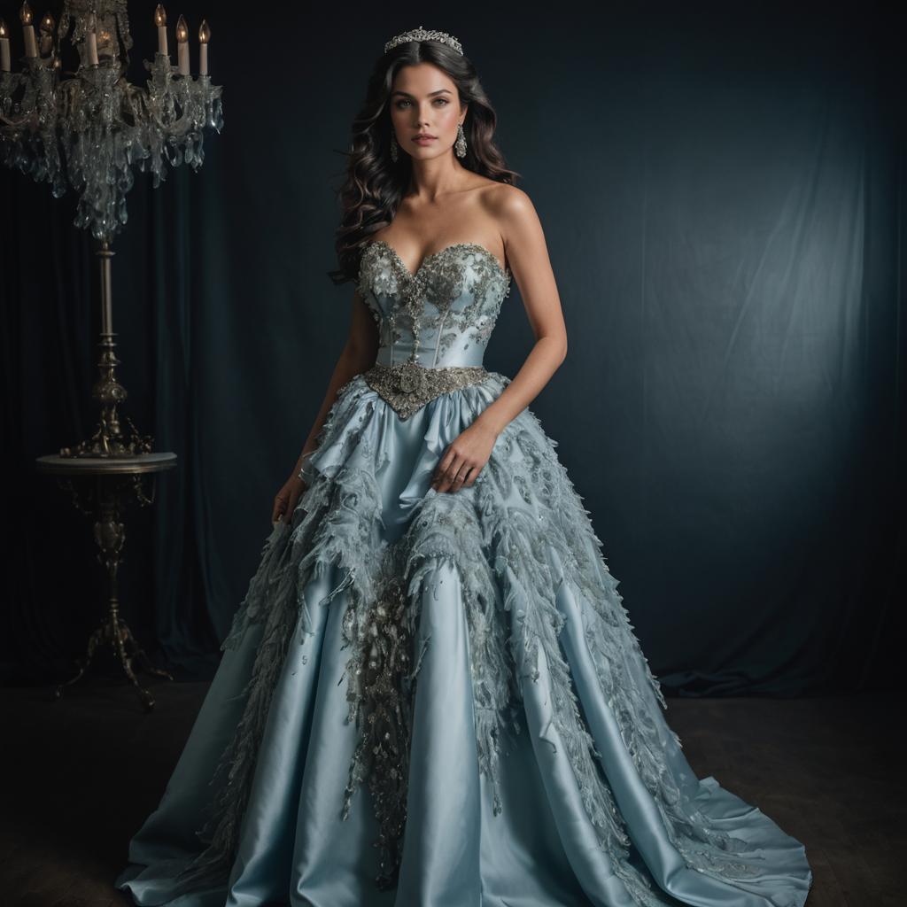 Full body studio portrait of a stunning woman with long dark wavy hair. She is wearing a icy pale blue faille A-line gown with intricate embroidery and long sheer sleeves. The waist is adorned with a belt of pearls and intricate green beading. underwater scene with flowing fabric, high fashion photography, photorealistic, 8k, sharp focus, glamour shot.