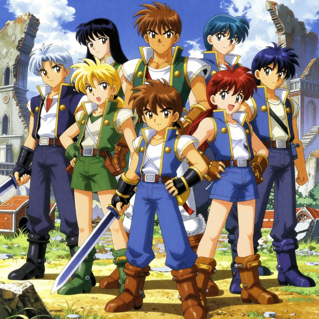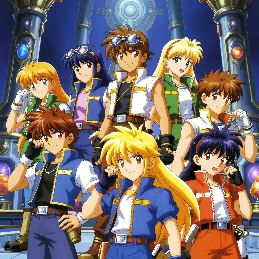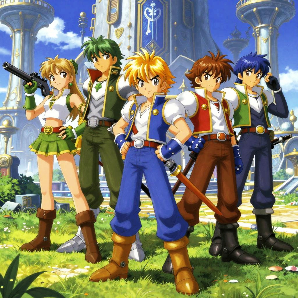 Chrono Trigger official art inspired scene, showcasing iconic characters in a lush, time-travel fantasy environment, intricate armor and clothing details, dramatic lighting with a blend of futuristic and medieval elements, emphasizing nostalgic yet modern art style.