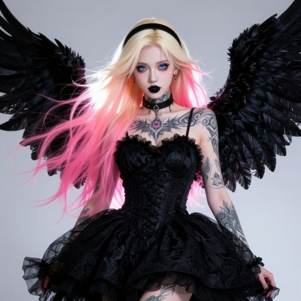 Score_9, score_8_up, score_7_up, 1girl 23 yo, goth beauty, blue beautiful eyes, black hairband, black choker, (blonde and neon pink hair, light through hair, glow:1.2), black matte lipstick, piercing ears, (heavily tattooed (breathtaking tattoo design)), black brocade dress, fractal raven wings, dynamic composition, lights emerges out of the frame, photorealistic very attractive beautiful imperial colors ultra detailed 3D, Very Intricate, full body in shot, low anglepureerosface_v1, DonMn1ghtm4reXL