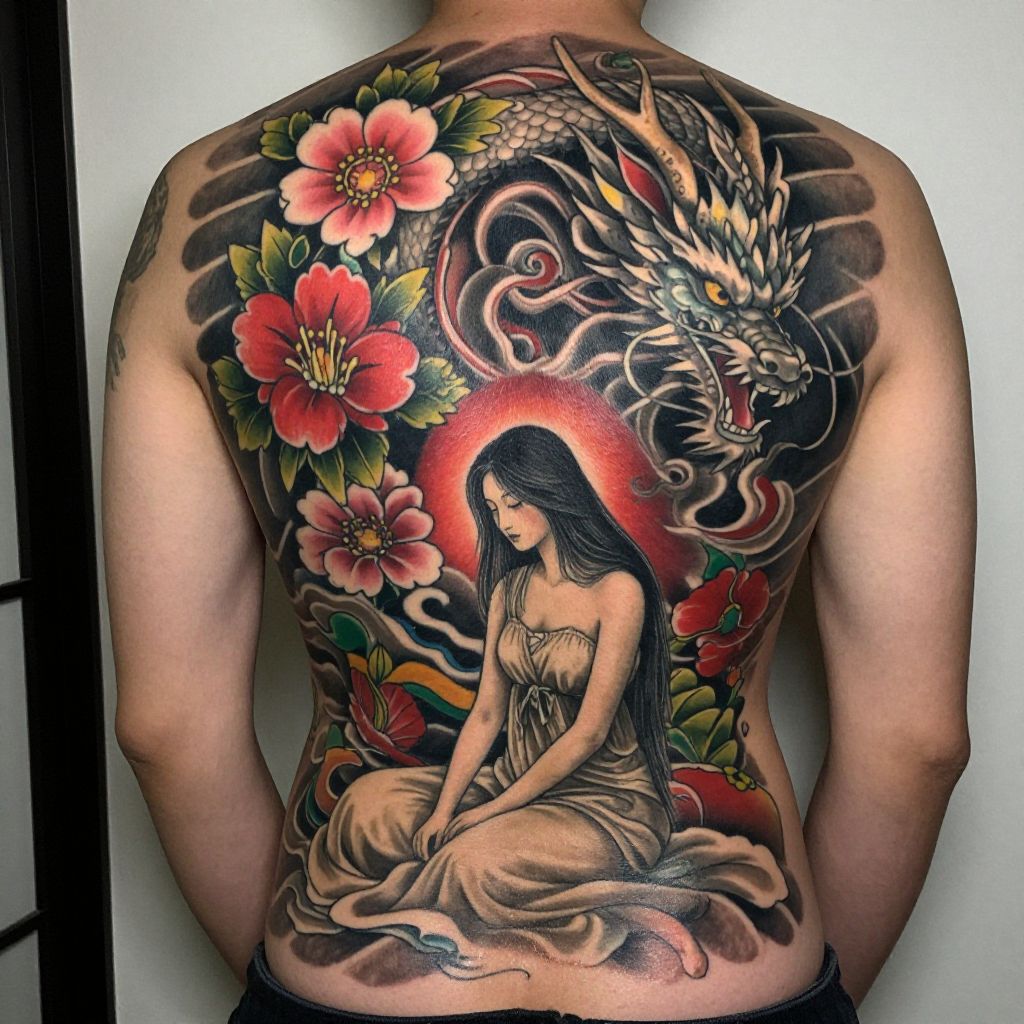 Photograph of a person with their back facing the camera, showcasing a vibrant, detailed tattoo of a woman with long dark hair, surrounded by colorful flowers and a blue dragon. The person has dark hair in a bun and is wearing a black long-sleeve shirt. The background features a brightly colored, abstract painting. The tattoo artist's logo is in the bottom right corner.