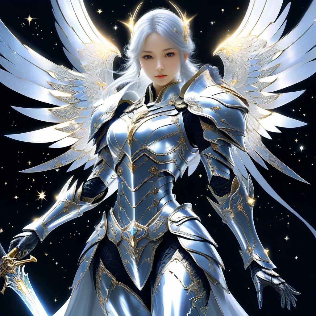Celestial Guardian Aetherwing, A radiant, celestial knight with shimmering silver wings that glisten like stars. She wears a suit of armor that radiates with cosmic energy and carries a sword forged from starlight, digital art, by Yoshitaka Amano.