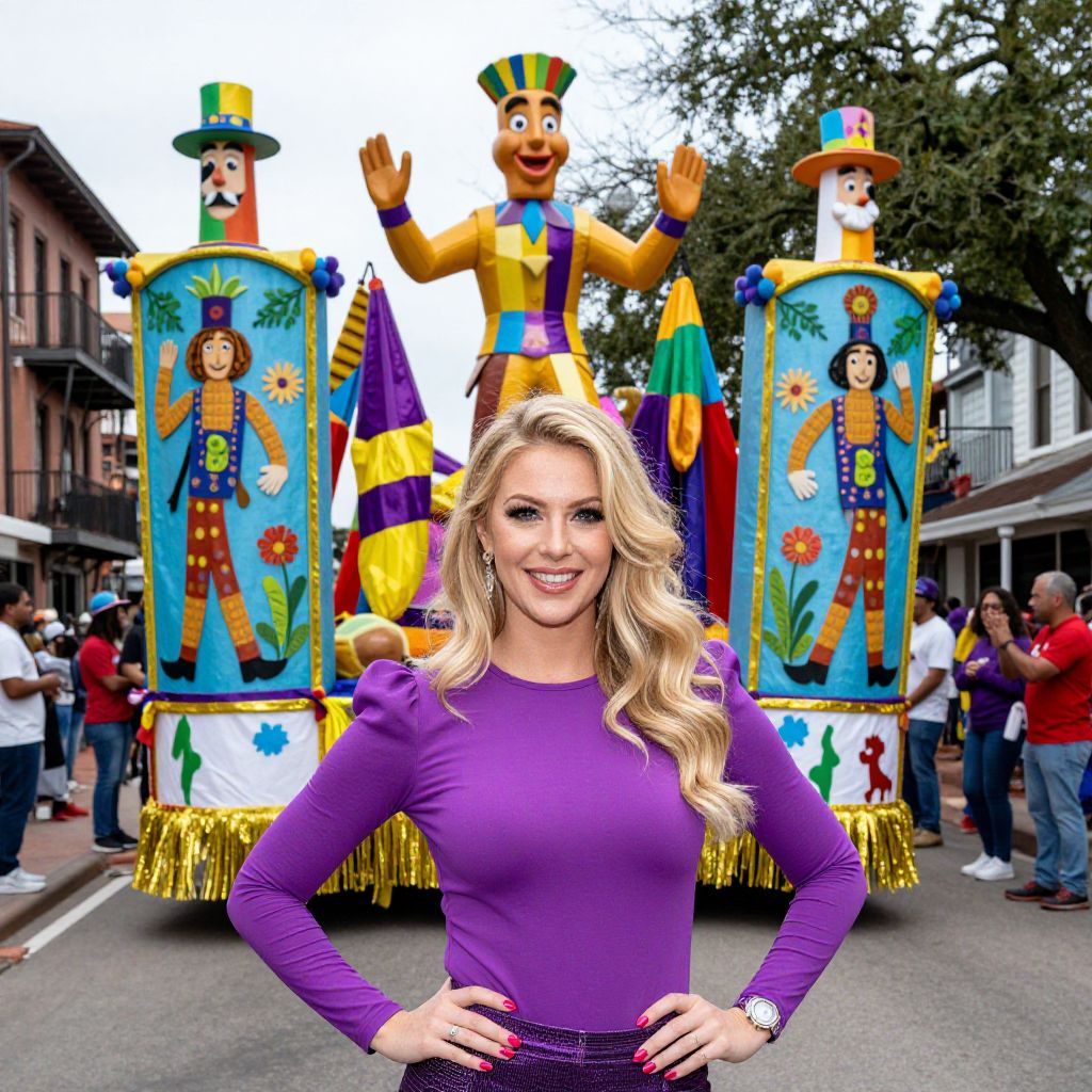 Blonde-haired woman posing confidently in a vibrant purple top, framed by two elaborately decorated parade floats featuring whimsical designs and colorful characters, amidst a lively street scene at Mardi Gras World.