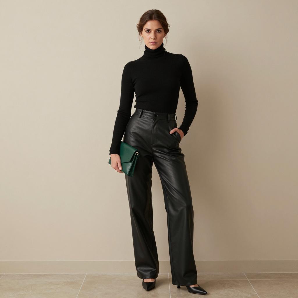 A confident woman with long dark hair stands against a modern grey tiled wall wearing a sleek metallic silver pantsuit featuring structured shoulders. She accessorizes with silver bracelets, drop earrings, and black high heels while carrying a large black handbag, showcasing a powerful and contemporary fashion style.