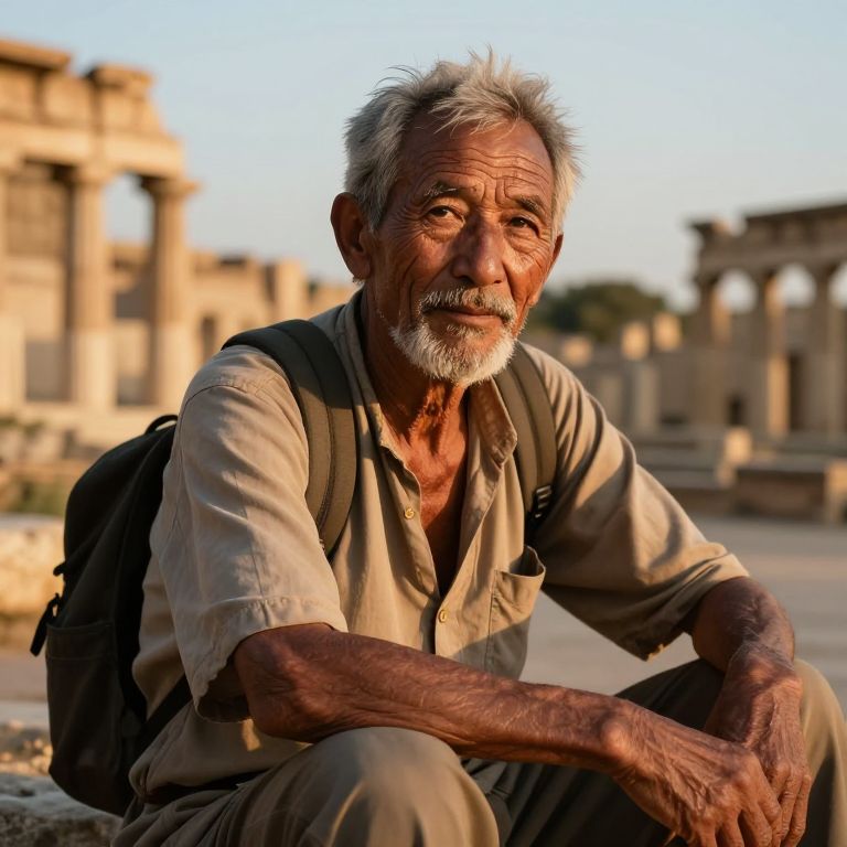 Photograph of an elderly Indian man with weathered skin, gray hair, and a white beard, sitting outdoors at an ancient ruins site. He wears a beige, short-sleeved shirt, khaki pants, and a black backpack. His expression is calm and slightly smiling. The background features blurred, sunlit stone columns and arches of a historical structure, suggesting a warm, late afternoon setting. The man's hands rest on his knees, and the sunlight casts soft shadows, highlighting his aged, textured skin. The overall color palette includes earthy tones and warm sunlight.