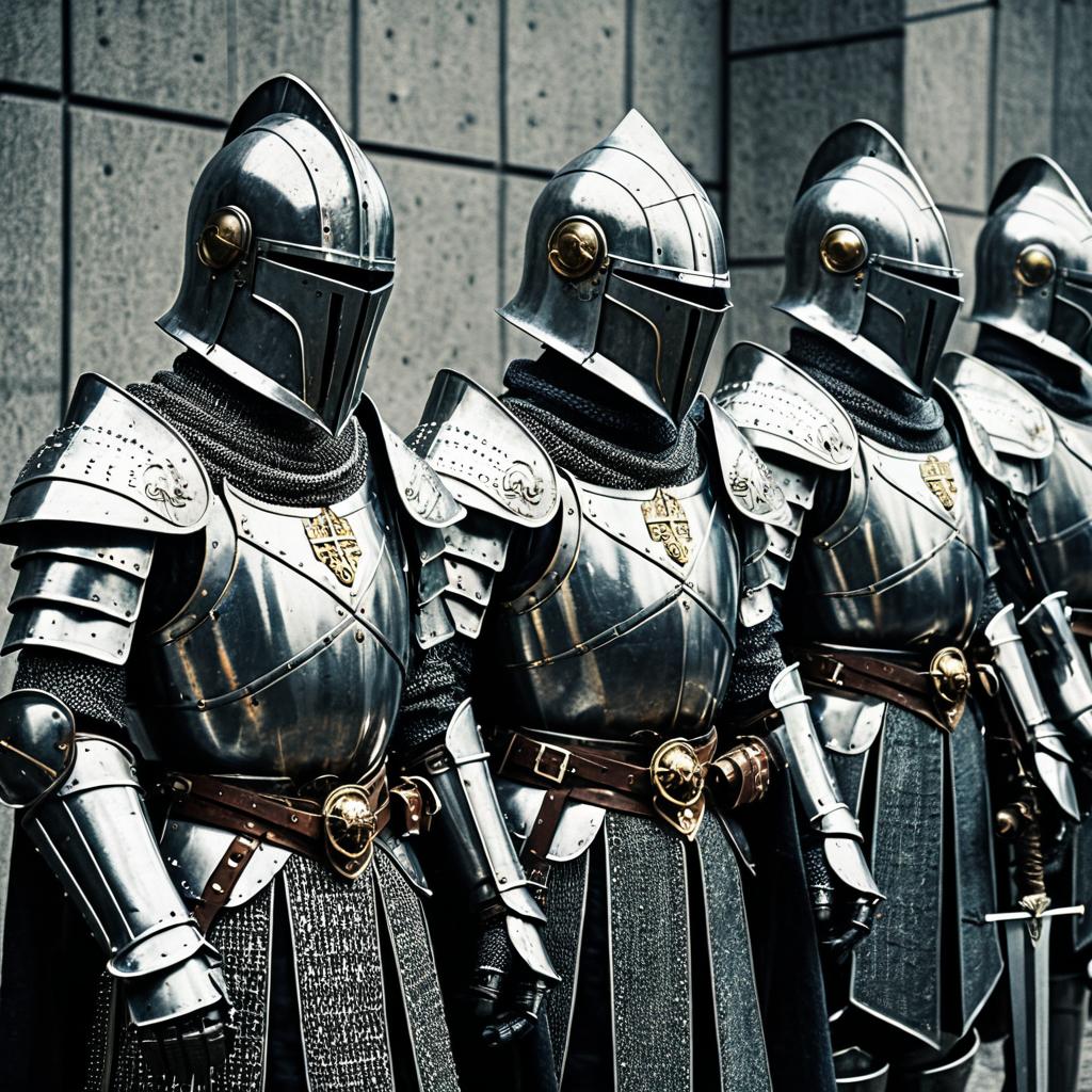 A row of four medieval knights wearing intricately detailed silver armor with gold accents and helmets. The armor features chainmail and leather belts with ornamental clasps. The setting is against a modern, textured stone wall, highlighting the contrast between medieval design and a contemporary backdrop.