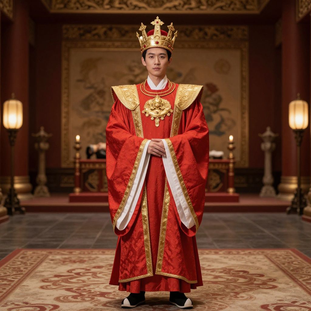 Modern King Costume, man in a golden crown and red robe standing in a large room