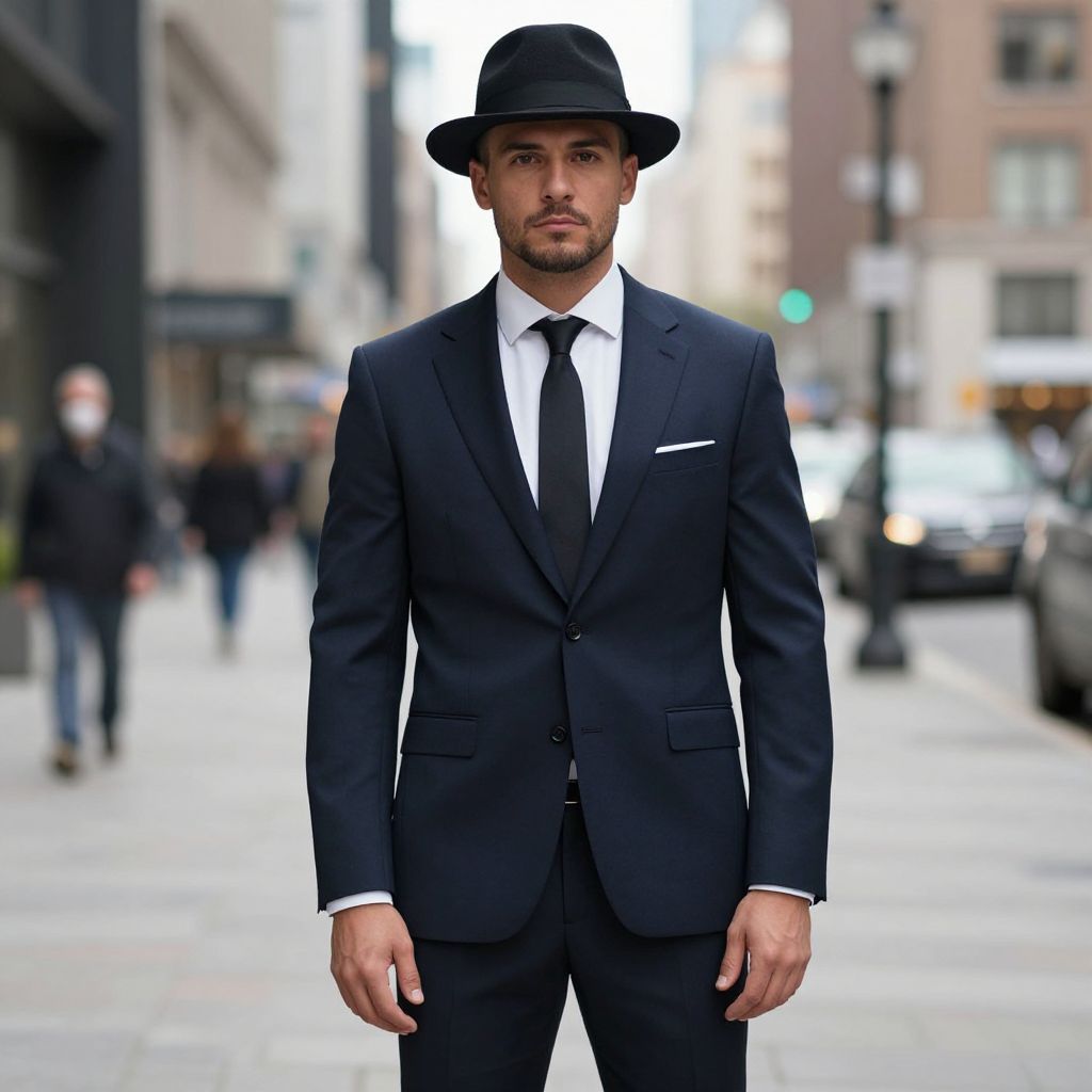 Todays Man Fashion Costume, man in a suit and hat standing in a city