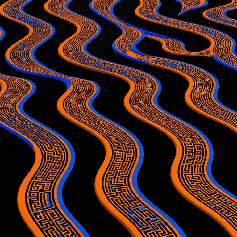 Digital artwork featuring wavy, ribbon-like paths on a black background. The paths are outlined in vibrant orange with intricate, maze-like patterns inside. A glowing blue outline enhances the wavy edges of each path. The overall style is abstract, with a focus on dynamic, flowing lines and contrasting colors. The texture of the maze patterns is sharp and detailed, while the orange and blue outlines are smooth and luminous. The wavy paths create a sense of movement and depth across the image.