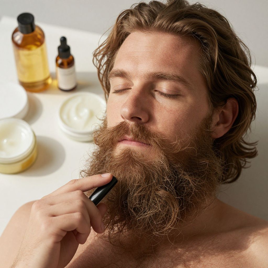 How to train your beard, a close-up portrait of a man gently brushing a long, wavy beard, surrounded by natural beard care products like oils and balms, serene expression, soft sunlight illuminating the face, high detail realism with textured hair and skin