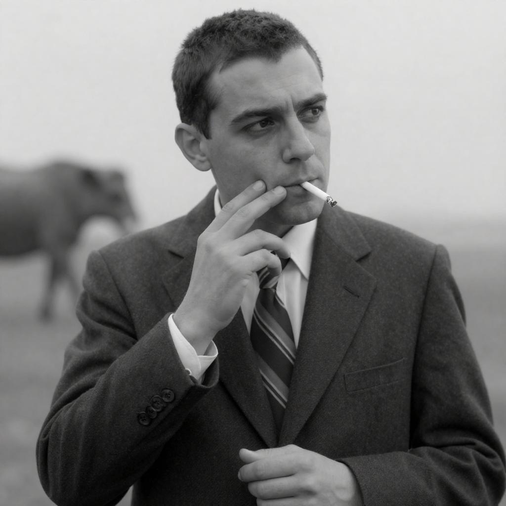 Black-and-white photograph of a man with short dark hair wearing a dark woolen suit, a white shirt, and a striped tie. He holds a cigarette near his mouth and looks to the right with a serious expression. The background is blurred with the faint silhouette of an animal, possibly a horse or similar, adding depth to the composition.