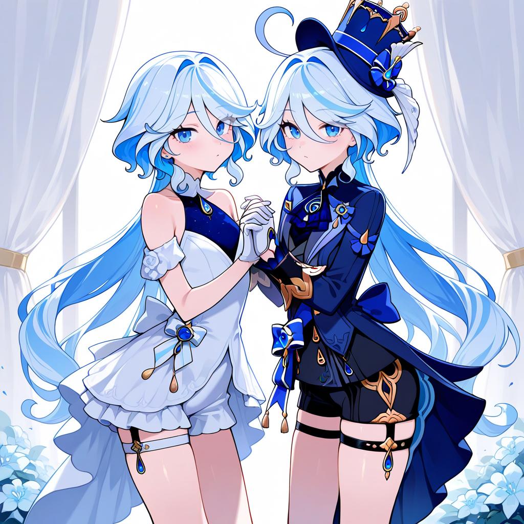 Digital illustration of three anime-style girls with blue hair and vibrant eyes embracing each other. Each character wears detailed blue and white outfits with gloves and ribbons, showcasing a blend of fantasy and modern design elements. The setting is softly lit, highlighting the characters' expressions and intricate costume details.