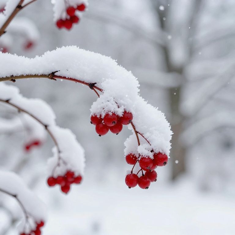Snow-dusted branches hold vibrant red berries, their glossy surfaces glistening beneath a soft blanket of fresh snow, set against a serene winter backdrop of falling flakes and blurred trees.