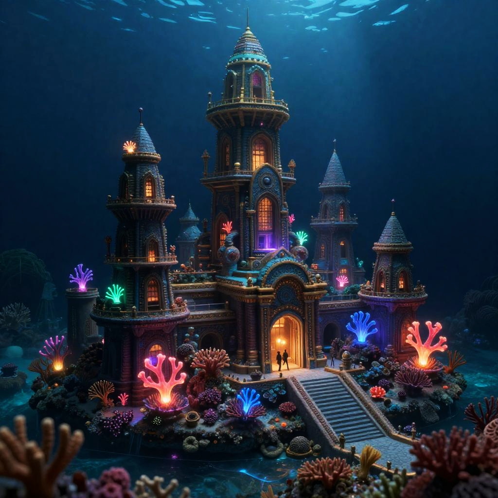 Realistic photo.3D render of a vibrant underwater city, detailed coral structures, illuminated by bioluminescent creatures, set against a dark ocean backdrop, fantasy adventure vibe. realistic photo