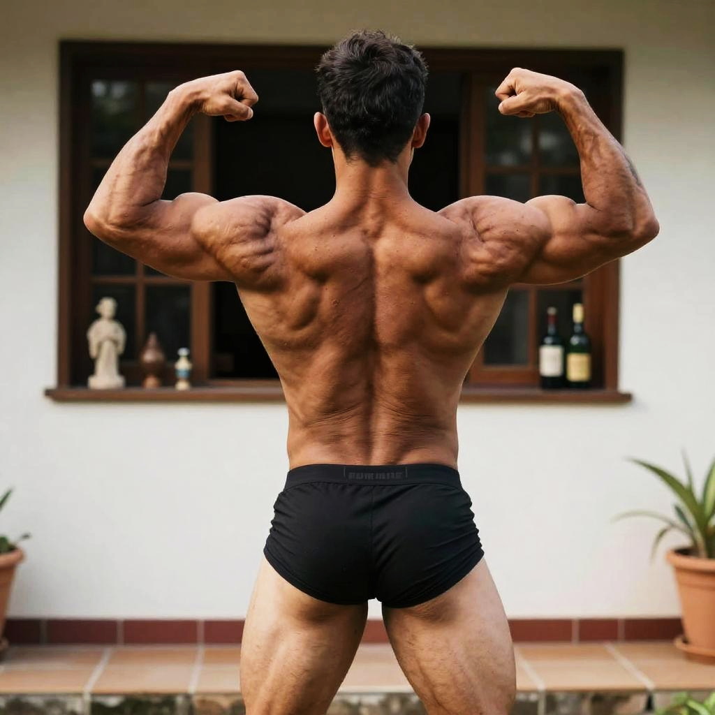 Photograph of a muscular, tan-skinned man standing nude with his back to the camera, flexing his biceps. He has a tattoo on his upper back and short, dark hair. He's standing on a tiled patio in front of a window with various small objects like statues and bottles on the windowsill. The lighting highlights his defined muscles and the texture of his skin.