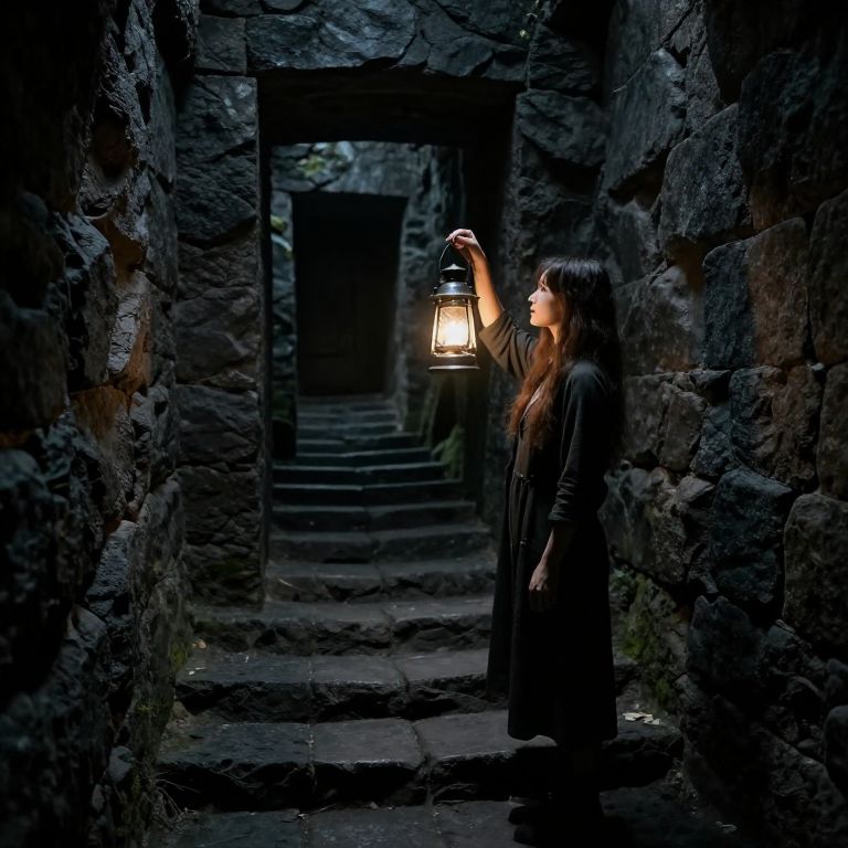 Mysterious silhouettes of three figures stand beneath a circular light source, casting elongated shadows onto a textured stone wall, illuminated by a vintage lantern with a glowing orb, set against a cobblestone floor in a dimly lit chamber.