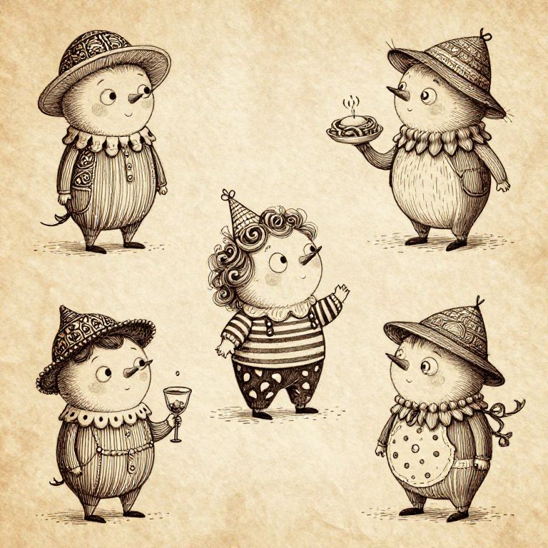 Pictures of art drawings illustrating whimsical ink illustrations with fine linework, playful characters, and intricate patterns, rendered on aged parchment paper with subtle sepia tones for a vintage feel