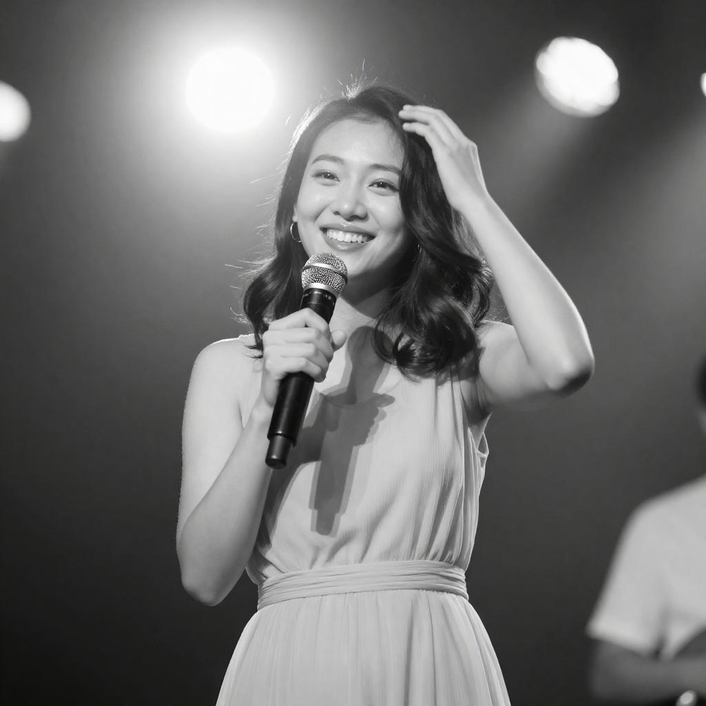 Black-and-white photograph of a female dancer in a sparkly, strapless dress, posing with one arm raised, silhouetted against bright star-shaped stage lights. A crowd of spectators is visible in the dark background, creating a dramatic contrast.