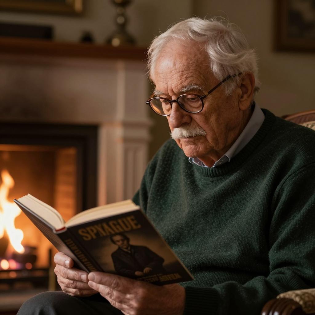 Elderly man with gray hair, wearing glasses and a dark sweater, sits at a desk, writing in a notebook. Desk has stacks of books, a lamp, and papers. Background has bookshelves, wooden cabinets, and a wall sconce. Natural light enters from a window. Realistic photograph.