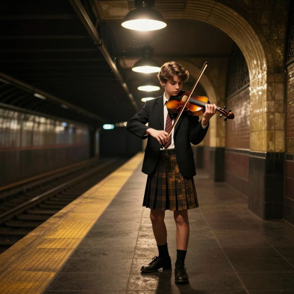 A teenage violinist in a worn vintage school uniform standing in a empty Art Deco subway platform, illuminated by single overhead spotlight with warm brass reflections and drifting dust motes. The scene evokes a lonely, cinematic, and quietly suspenseful mood, reminiscent of classic film styles, featuring rich colors and deep storytelling elements.