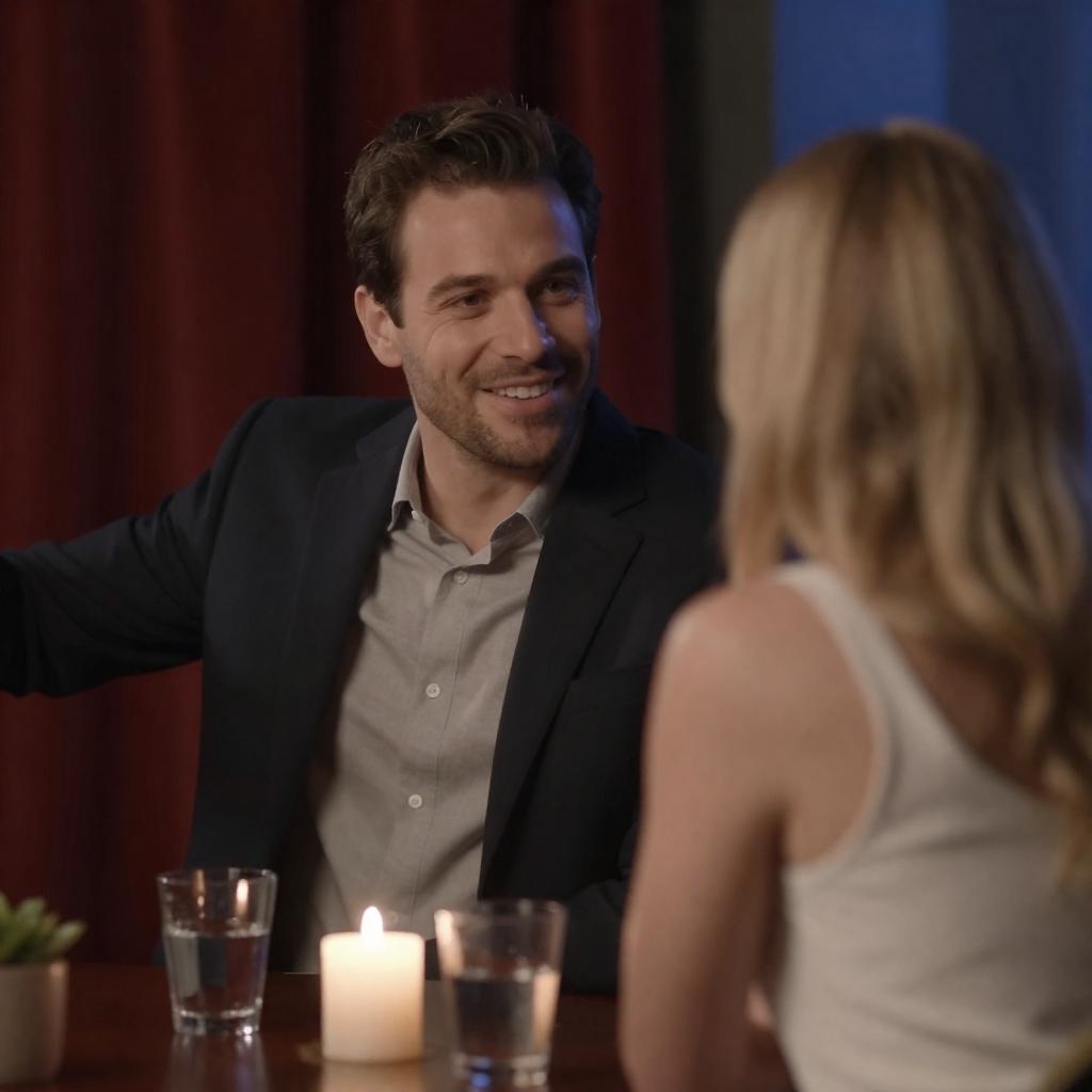 Photograph of a man with short brown hair and light blue shirt, smiling while handing a black plate to a woman with brown hair in a black top. They are in a dimly lit, festive room with red curtains, string lights, and ornate wooden posts. The man leans forward, holding the plate with both hands. The woman reaches out to take it.