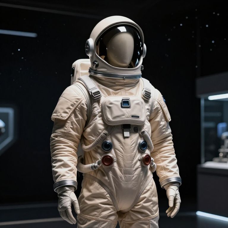 A mannequin standing in a futuristic, empty showroom, wearing a detailed beige space suit with a sleek, polished helmet on its head. The suit has a smooth, reflective surface with subtle texture resembling fabric and padding, and the helmet features a small visor and rounded design. The mannequin is slightly tilted, facing the viewer, with a neutral, static expression. The background is a dark, starry void with faint glowing lines, suggesting a space environment. The lighting is soft and cool, emphasizing the contrast between the warm beige suit and the deep space backdrop.