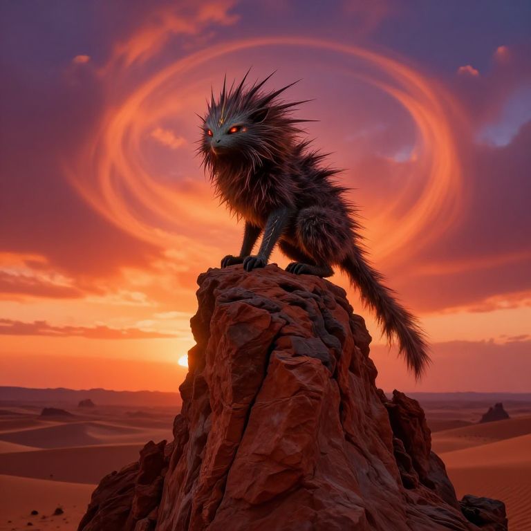 A digital illustration of a fantastical, dark-furred, wolf-like creature with spiky fur and glowing red eyes, standing atop a rugged, reddish rock in a desert landscape. The background features a vibrant, orange and purple sunset with a striking, circular cloud formation. The creature's fur is detailed with a mix of dark browns and blacks, contrasting sharply with the bright, colorful sky. The desert extends into the horizon with rolling sand dunes. The image has a surreal, otherworldly feel with rich, contrasting colors and dramatic lighting.