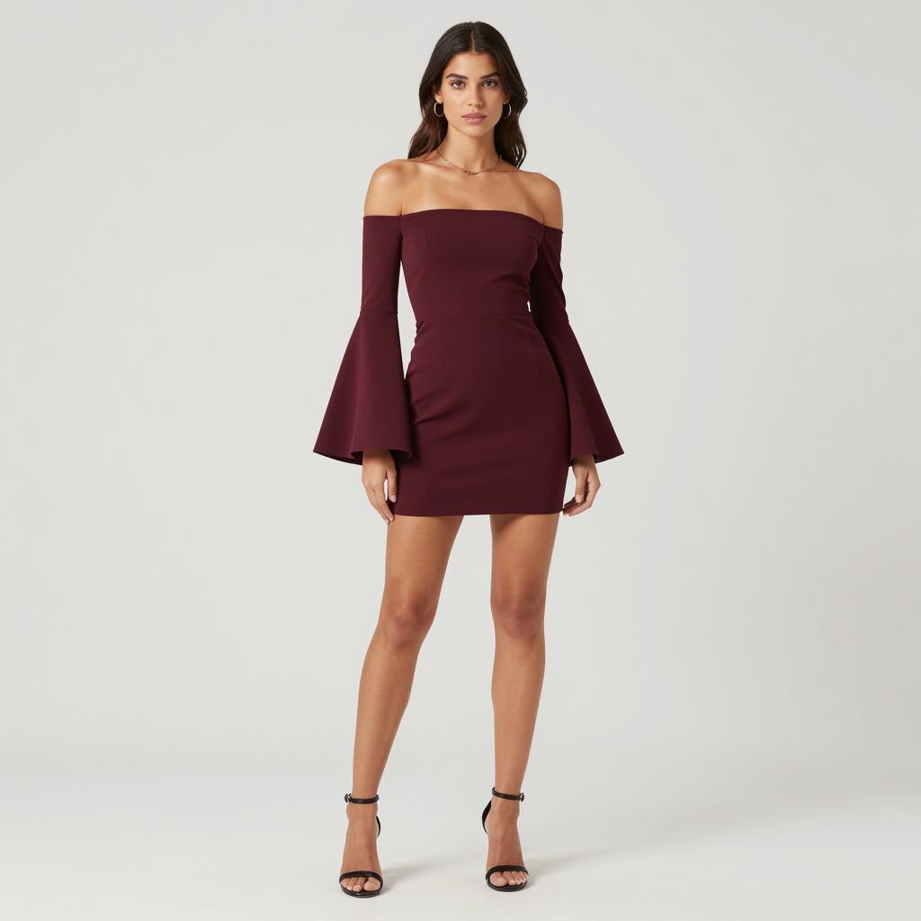 The woman is dressed in a contemporary chic maroon off-the-shoulder mini dress featuring dramatic bell sleeves, highlighting a modern and elegant style. She completes the look with black ankle strap heels, standing confidently in a minimalist studio setting.