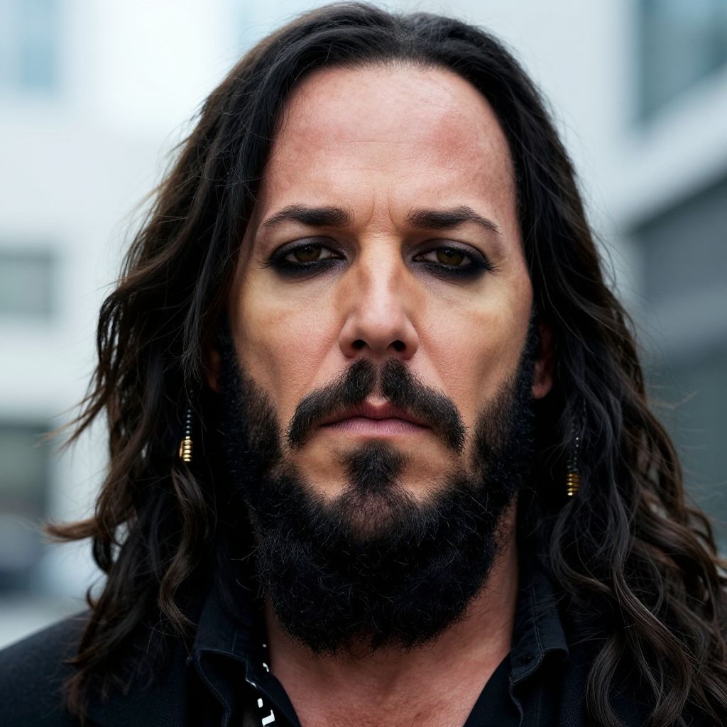 Photograph of a middle-aged man with long, wavy black hair and a full beard, wearing a black shirt. His skin is light, and he has dark, intense eyes with subtle makeup around them. He wears small hoop earrings in both ears. The background is blurred, featuring indistinct urban elements with muted colors, suggesting a city street. The image has a high-contrast, slightly exaggerated style, highlighting the man's facial features and giving a dramatic, almost surreal effect. The overall mood is serious and intense.